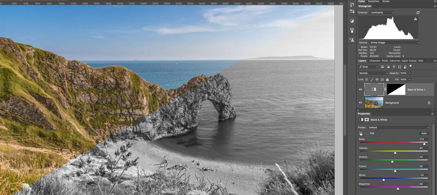 برای کنترل بیشتر، از لایه تنظیمی Black & White در فتوشاپ استفاده کنید. این روش غیرمخرب اسلایدرهایی برای تنظیم مشارکت رنگهای خاص در تصویر خاکستری نهایی ارائه میدهد. با اسلایدرها بازی کنید و همزمان هیستوگرام را بررسی کنید تا از بریدگی (clipping) جلوگیری شود. میتوانید ترکیبهای سفارشی را بهعنوان پریست ذخیره کرده و در آینده استفاده کنید. همچنین میتوانید یک تهرنگ (tint) به تصویر نهایی اضافه کنید تا حس گرمی بیشتری به چاپ بدهد. برای دقت بالاتر، فایل RAW را در Adobe Camera Raw باز کنید و از کنترلهای HSL/Grayscale برای تنظیم هشت دامنه رنگی استفاده کنید.