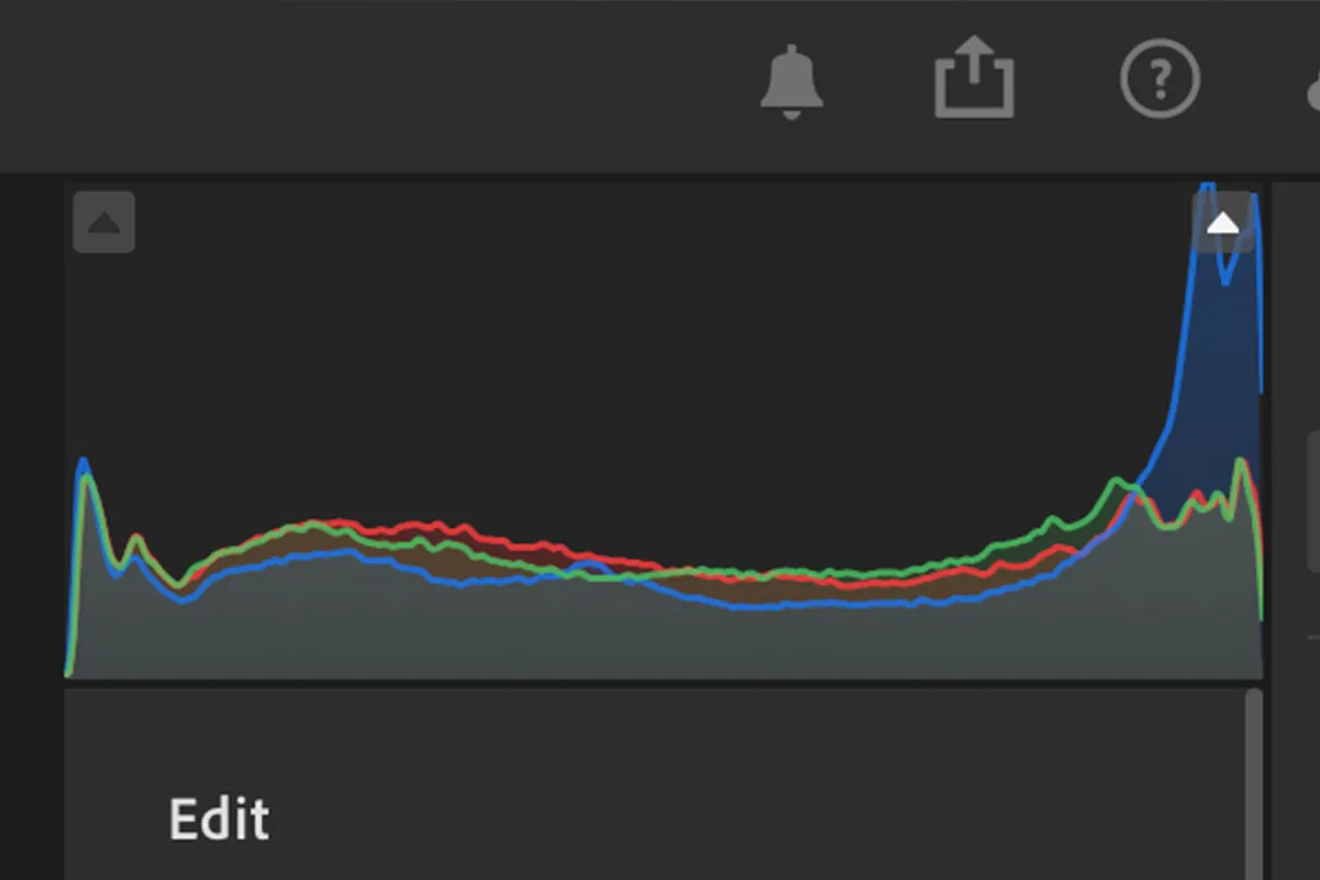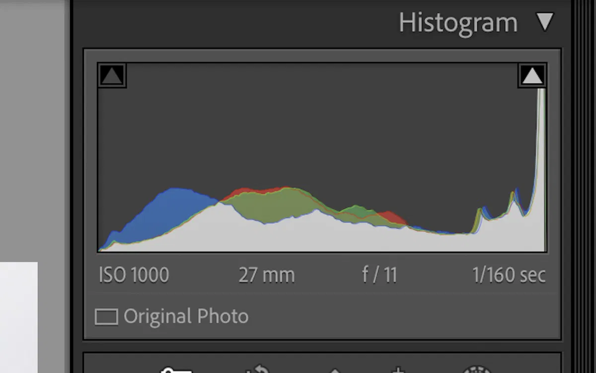 هیستوگرام لایتروم راه سریع و آسانی برای نشان دادن این مناطق clipped فراهم میکند. میتوانید این مناطق را با پیدا کردن مثلثهای بالای سمت چپ و راست هیستوگرام هایلایت کنید. سمت چپ نمایانگر سیاهها و سمت راست نمایانگر سفیدها است.