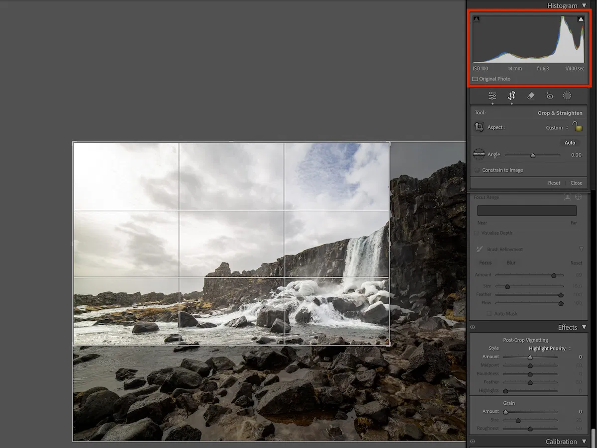 اولین نکتهای که باید در نظر گرفت، این است که آیا قصد دارید عکس خود را برش دهید یا خیر. هیستوگرام بسته به تونهایی که در انتخاب فعلی شما هستند و با حرکت مرزهای برش تغییر خواهد کرد. این میتواند به شما کمک کند دامنه دینامیکی مناسب در تصویر خود را انتخاب کنید.